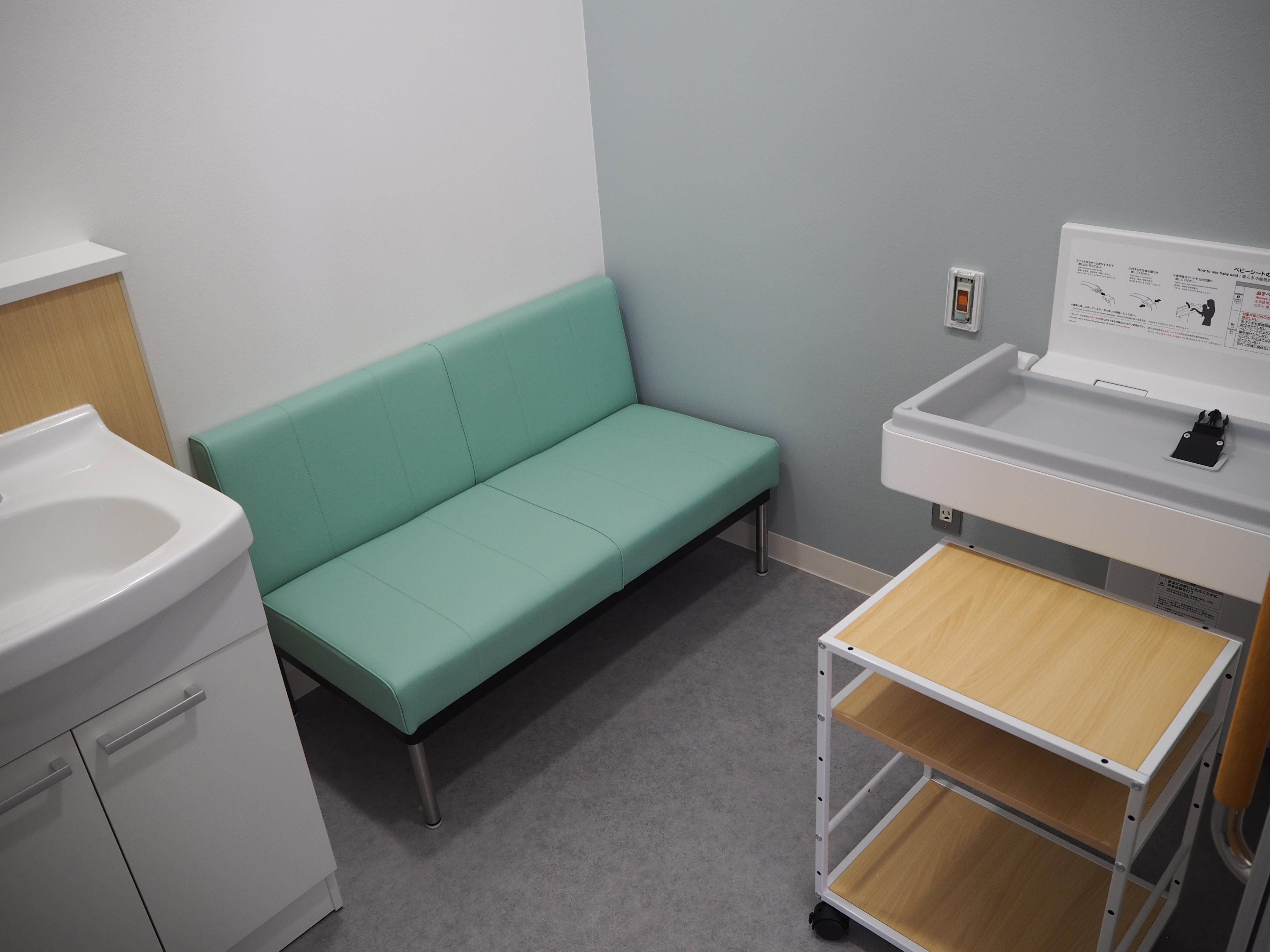 授乳・おむつ替えスペース内観(おむつ交換台、水栓、エアコン、ソファ、荷物置)