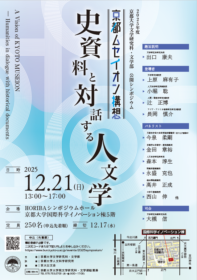 本シンポジウムは、文学研究科をはじめとする京大の各部局において「もの」と「こと」の両面にわたる史資料を研究している研究者に自らの研究の最前線を紹介して頂くと共に、京大内外のキープレーヤーに「京都ムセイオン」についての期待と夢を存分に語って頂く機会です。皆様のご参加を心よりお待ちしております。