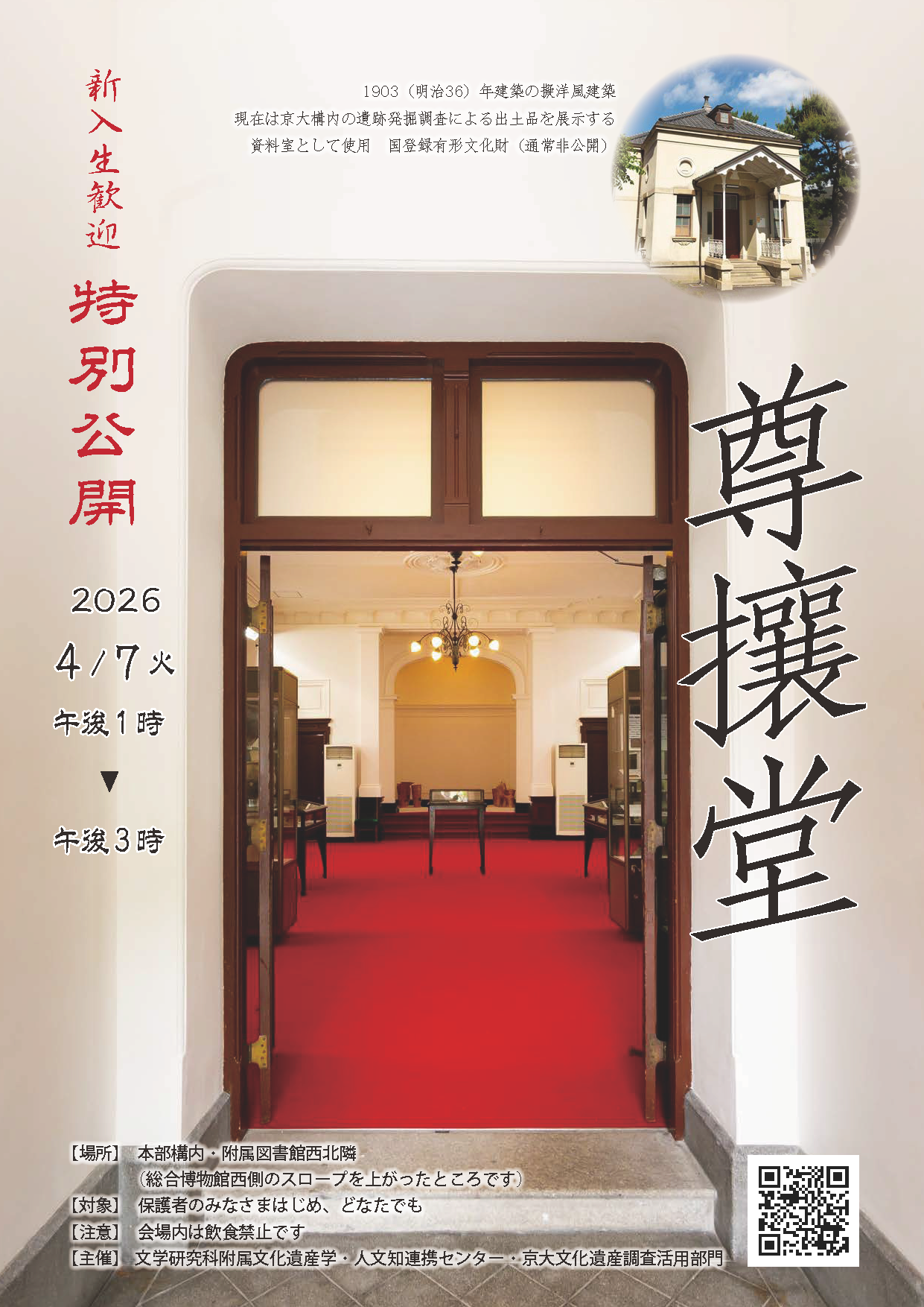 ※画像をクリックするとPDFが開きます。 日 時 4月7日(火) 13:00~15:00 場 所 文化遺産学・人文知連携センター資料室「尊攘堂」 対 象 保護者のみなさまはじめ、どなたでも 注 意 会場内は飲食禁止です 主 催 文学研究科附属文化遺産学・人文知連携センター 京大文化遺産調査活用部門